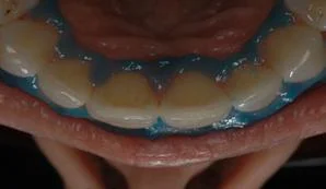 The ideal whitening process should be 90 minutes. Usually there is a need to add additional whitening gel at the 1 hour mark due to washout of the gel from the tray. The gingival barrier should not be dislodged from its position if adequate space for the barrier was created during the tray preparation phase.